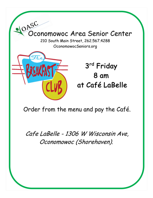 Join us each month for a good breakfast and friendly conversation. It’s a wonderful way to connect with fellow OASC members, catch up on Center news, and share a few laughs to start the day.