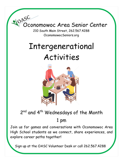 Our Intergenerational Activities bring OASC members together with Oconomowoc High School students for meaningful, fun, and engaging experiences. These connections encourage conversation, shared learning, and laughter—proving that every generation has something special to share and enjoy together.