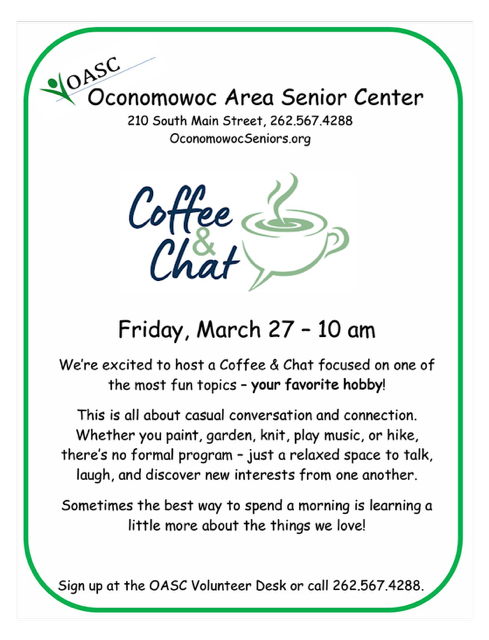 Take a break, pour yourself a cup of coffee, and settle in for Coffee & Chat—a relaxed, welcoming gathering centered on good conversation and easy connections. Enjoy simple refreshments, friendly faces, and the pleasure of spending time together in a no-pressure, comfortable setting.