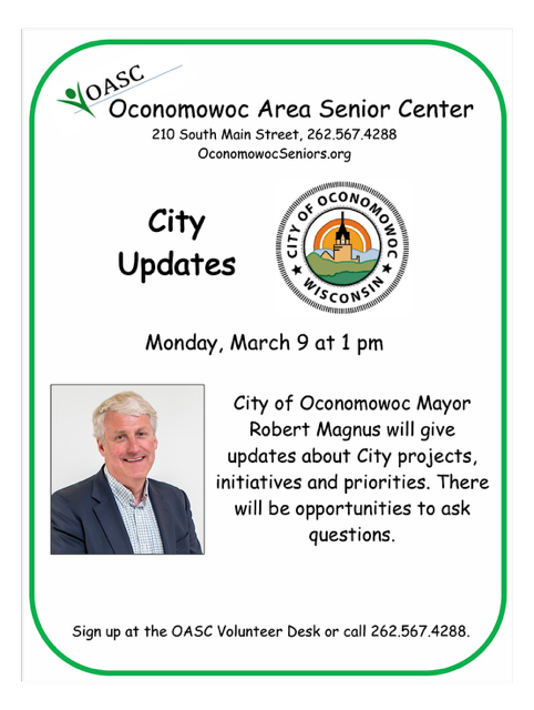 Mayor Robert Magnus will be sharing updates about some of the key projects and initiatives happening in Oconomowoc.